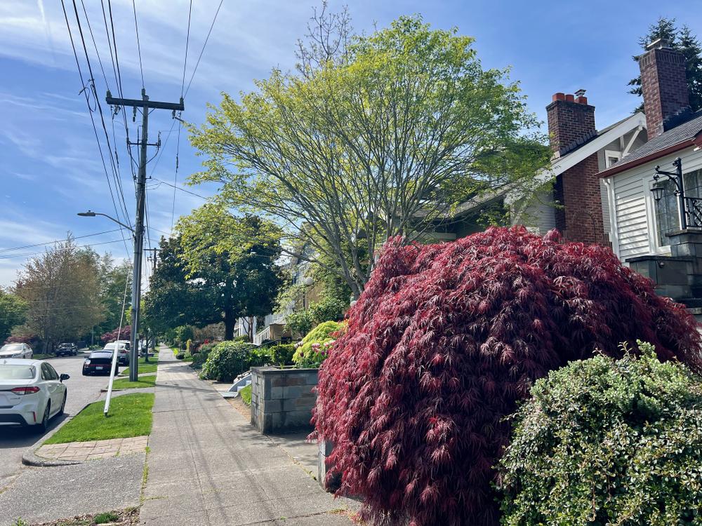 Our cat Moxie likes to hide in this red maple bush in front of a neighbor’s house. He appears to like looking out at things without being able to be seen himself.