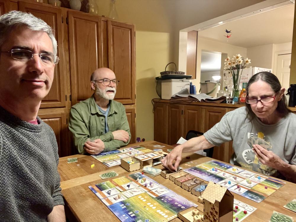 Jan and Lyn are a bit jet-lagged so go back to Middlebury to rest for a while. They return at dinnertime, and the five of them eat a home-cooked meal. After dinner Dave and Diane teach Jan to play the board game, “Wingspan”, which is loosely based on birds. Dave is an avid birder, which doesn’t confer any special strategic advantage in the game — but it does mean that Dave and Diane play the game often, and that does confer an advantage. Lyn tries to follow along for a while, but the games rules are quite complex, so she spends most of the evening talking with Chuckie.