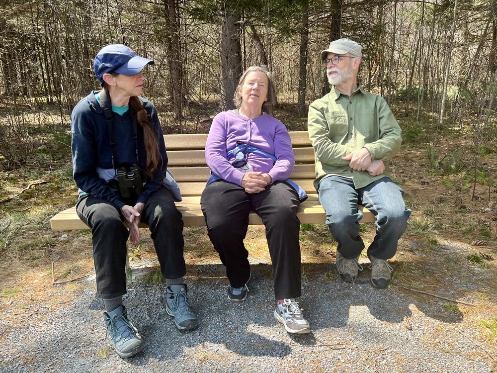They go to the Robert Frost Interpretive Trail, a pretty nature walk near land where Frost lived and wrote. The trail is decorated with plaques presenting some of Frost’s poems. Dave says the trail is a favorite place for him to go birding. As we walk along he tells us what kinds of birds we’re listening to, and he points them out when he can see them.