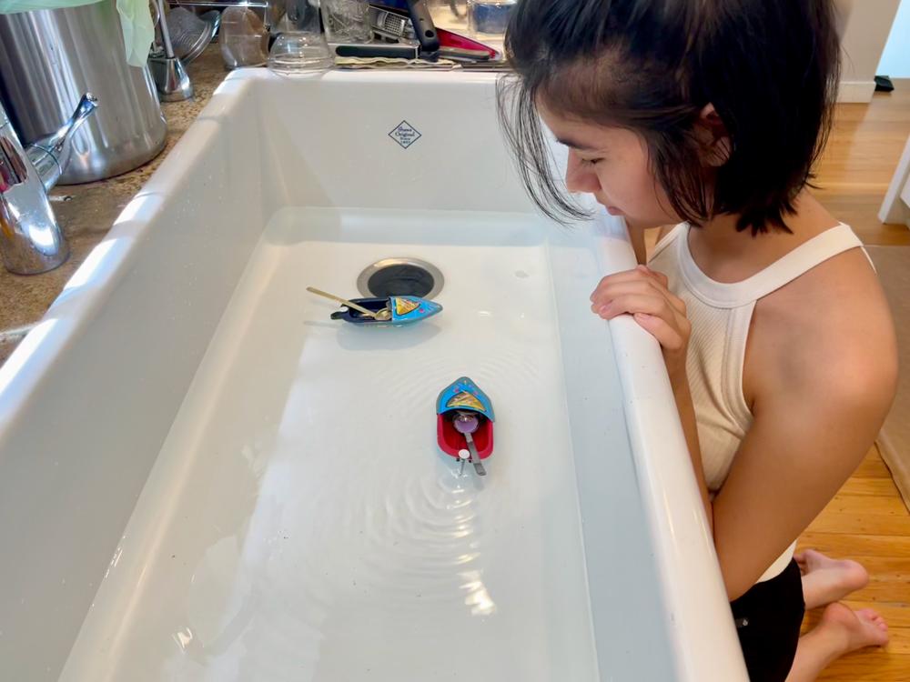 We retreat to the house to try the boats in our big kitchen sink. This goes much better!