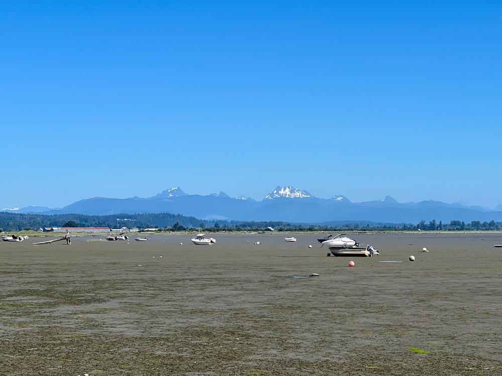 Our friends Leora and Paul host a Bastille Day party at their place on Camano Island. Angela and Jan drive up to spend the afternoon hanging out with people on the deck looking out at the beach. Near low tide we go for a walk along the beach — the water has gone far out from shore, stranding dozens of boats on the tidal flats.