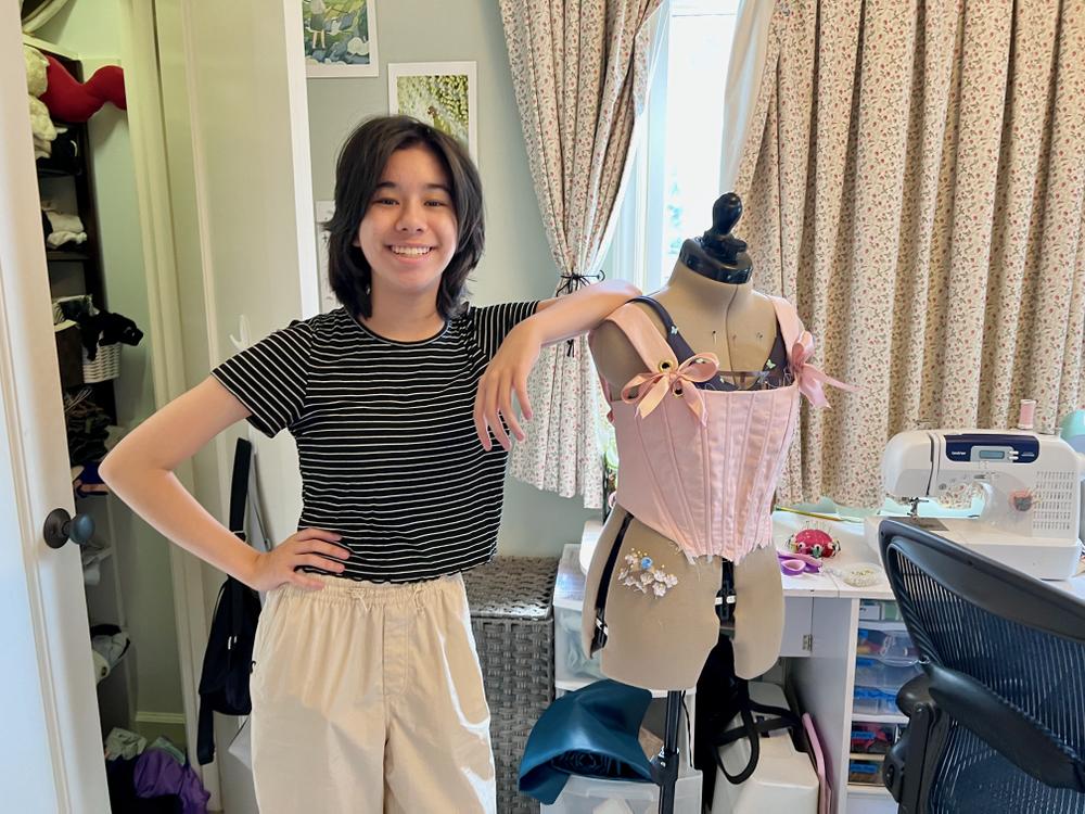 Angela’s birthday present to Bree was a dress form. It’s adjustable, so Bree’s able to dial it to her size, and the dress form makes it much easier to create clothing pieces. She’s delighted to begin using the dress form by making a corset for a cosplay outfit.