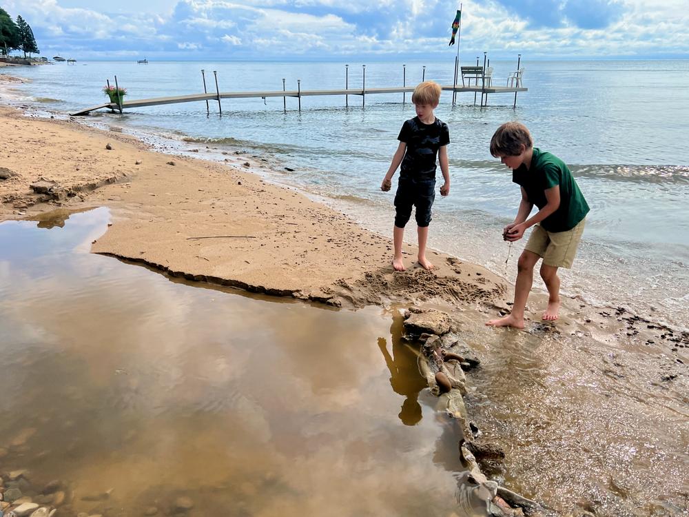 We shop for groceries at Neuman’s Market, then drop those off at the cottage. We head to the summer home of our cousin Gail, who lives in Au Gres for roughly half the year. She’s hosting a number of even more distant relations there, so we meet some cousins-of-cousins. Skye’s boys have fun playing in the lake with a younger boy belonging to a woman named Kelly, who seems to be a distant cousin-in-law.
