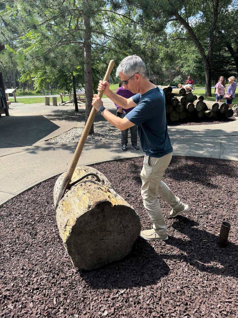 We also stop at the the Lumberman’s Monument, an homage to the manly men and their logs. Chris and I have fun playing with a peavey: a pole with a spike and hook used to move logs.