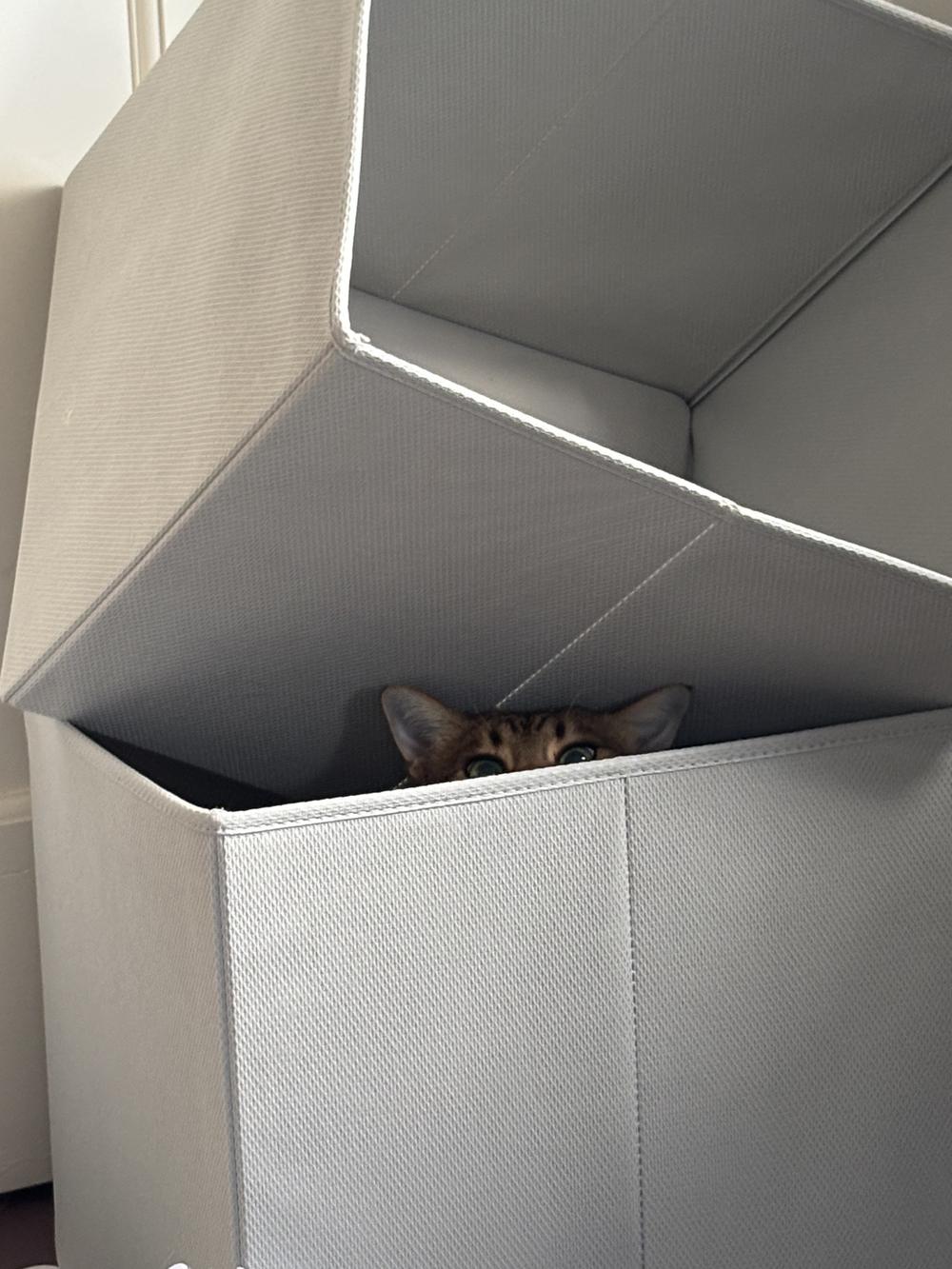 Bree sets aside one of the square shelving cubbies as a cat bed, but Mojo is much more interested in exploring the boxes that will go in the cubbies.