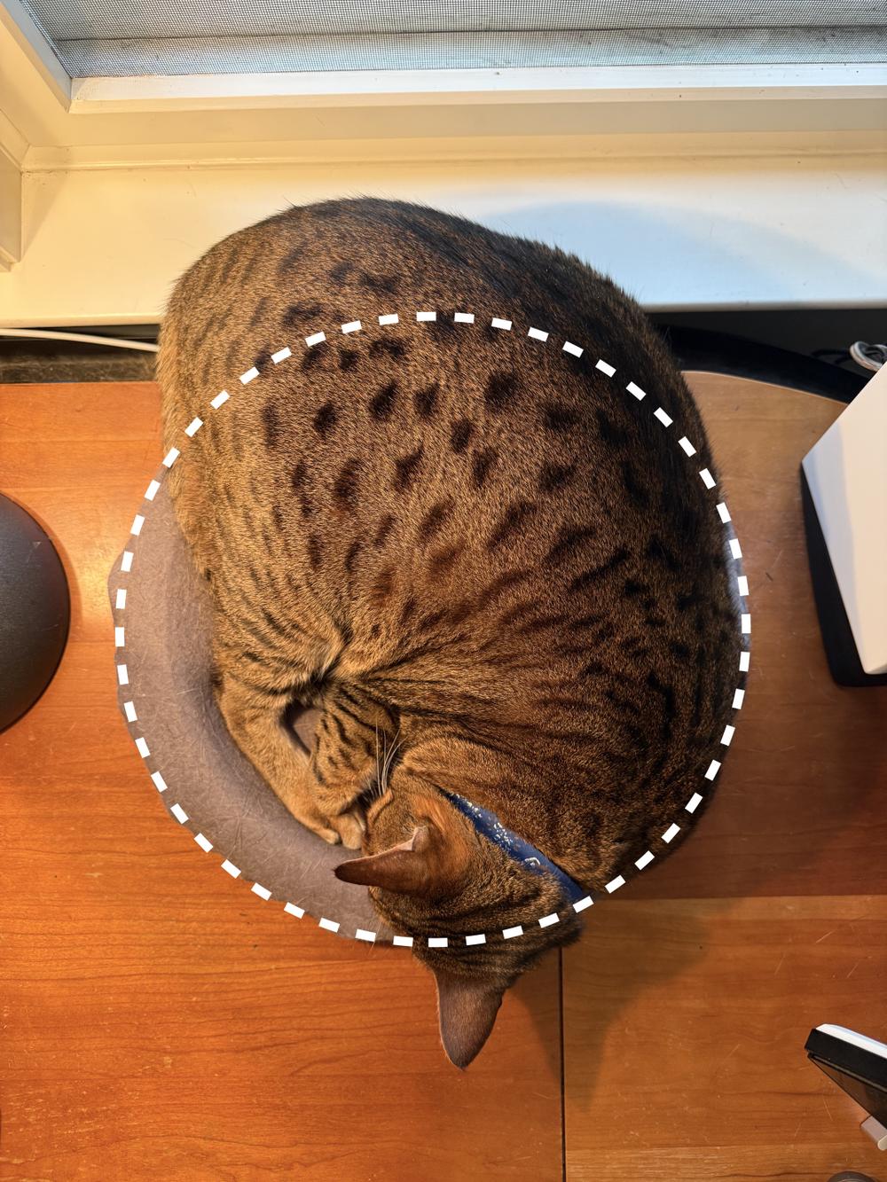 Mojo and Moxie really like sleeping in this circle on Jan’s desk. Mojo does not appear to be bothered that he does not actually fit in it.