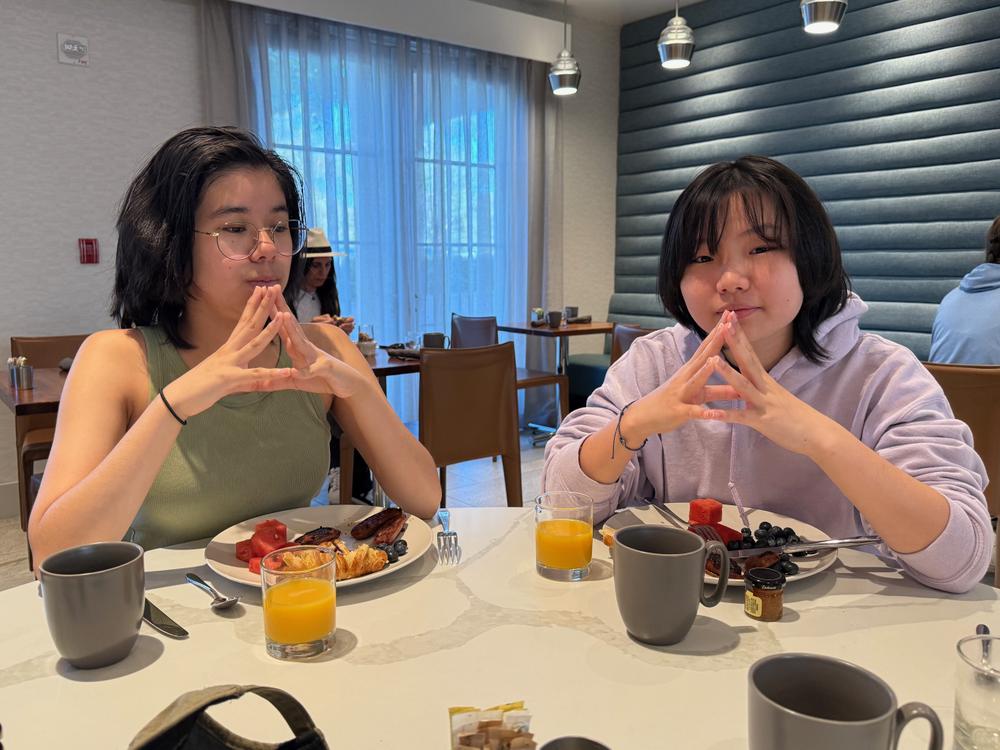 Bree’s good friend, Xyla, lives nearby so comes over with her dad for breakfast at our hotel. Over breakfast Bree and Xyla steeple their hands to show that they are scheming, and present their dads with a proposal to have Xyla come visit us in Seattle later this summer. This proposal is accepted.