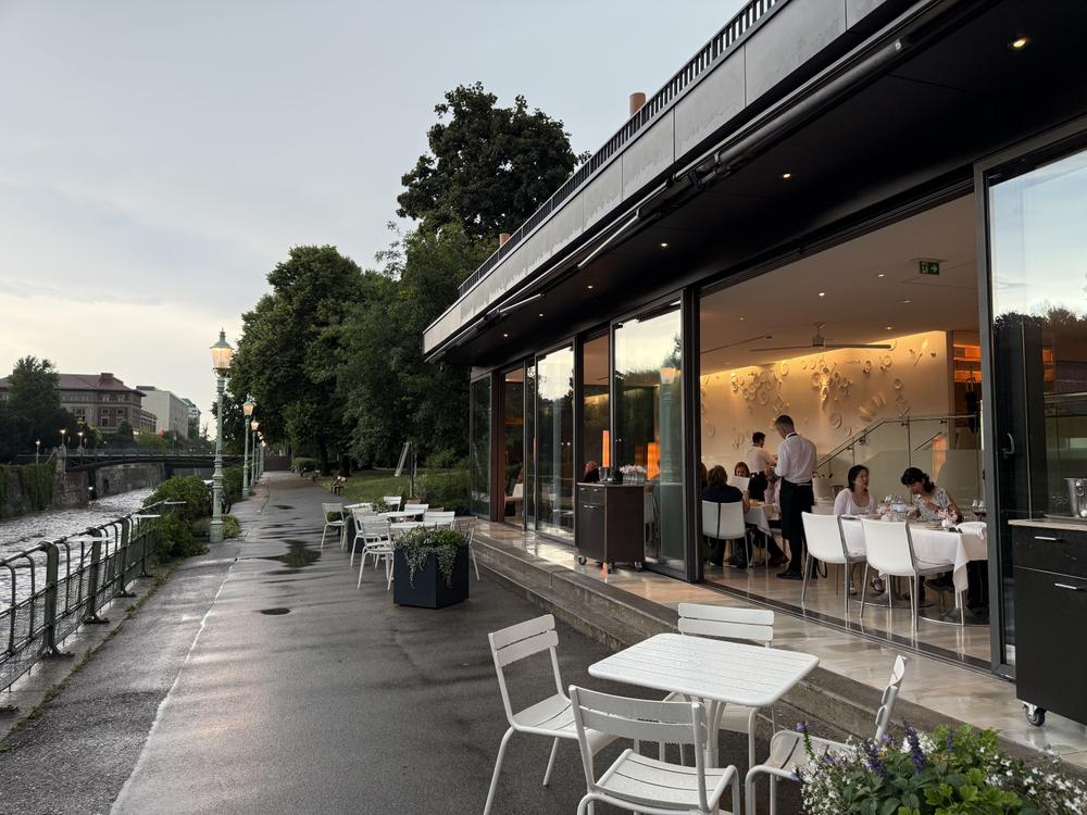 At dinnertime Bree once again elects to stay in the hotel. The rest of us walk to Meierei in the Stadpark (city park). This is quite a nice restaurant but not too busy, so though there are only four of us, they seat us at a long table for six by huge open sliding glass doors looking out at a river.