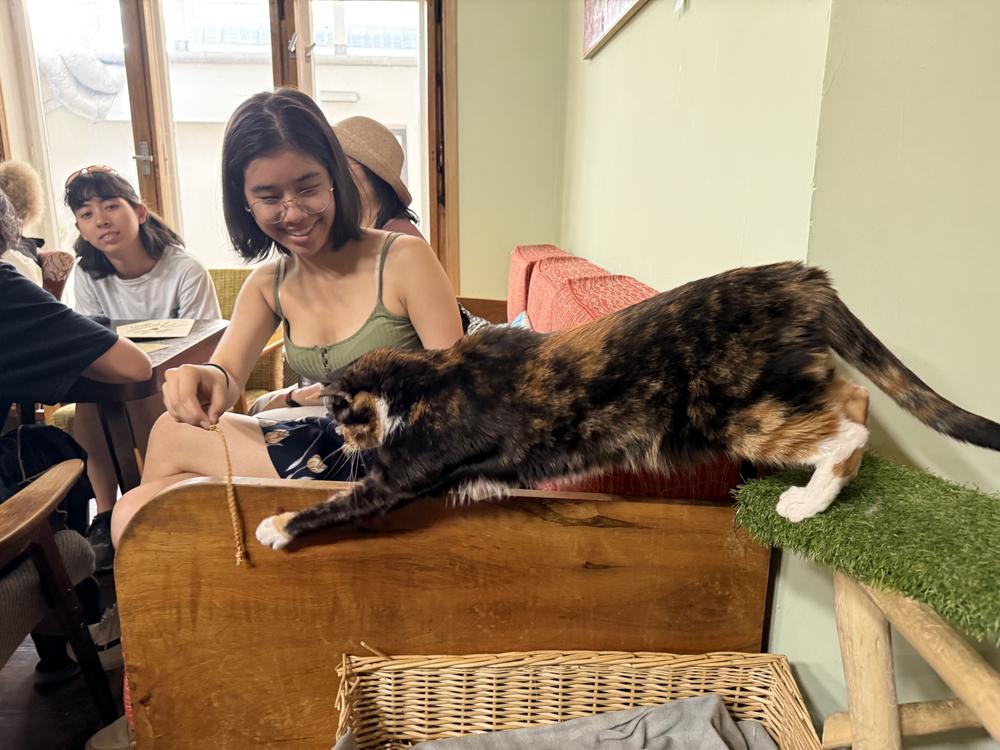 Next stop is Kočkafé Schrödinger, whose name is full of wordplay: kočka means “cat” + kafé, plus it references Schrödinger’s cat. The cat cafe is indeed full of cats: cats on chairs, cats walking around, cats sleeping in boxes, and a cat on a narrow bridge above us. Surprisingly, the room doesn’t have a strong cat smell. The menu takes the form of an origami cat. There’s also a brochure with a profile of each of the cafe’s cats, who live up to their descriptions: one cat is apparently deaf and is said to meow oddly; this is true. Bree is delighted with all the cats. She takes off the bracelet she made at breakfast and it becomes a compelling cat toy.