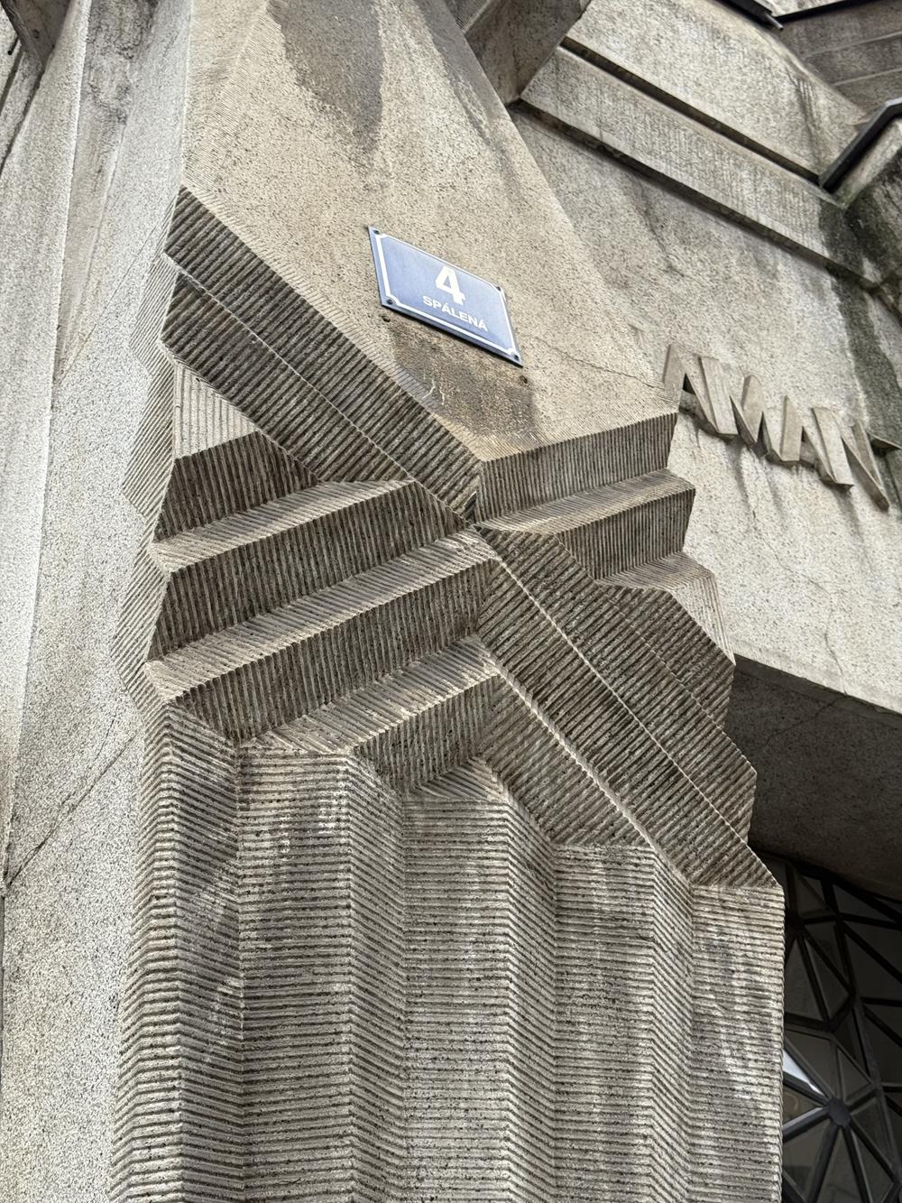 Standing in front of the Black Madonna building, the guide uses the building as an introduction to Czech cubist architecture, pointing out a number of small but interesting architectural finishes and details: angular planes and blocky elements in the building’s facade, repeated geometric shapes in the ironwork, and a distinctly asymmetric placement of the building entrance.