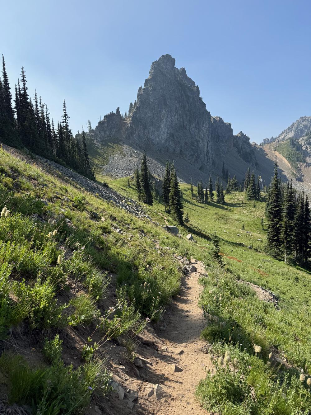 We circle around the lake, and begin a short, steep climb up to a pass that leads out of the cirque. It’s a perfect day and we have good views to Rainier behind us. At a rocky talus slope, we hear a sharp “Meep!” call — probably a pika, something like a large mountain hamster. We eventually spot the pika standing boldly on a rock, defending his territory. He’s adorable.