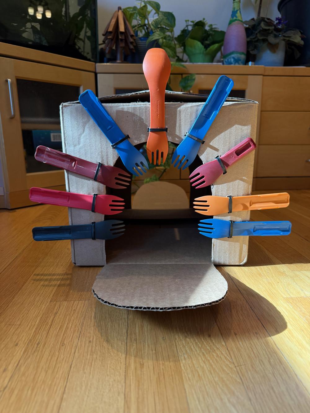 Today Bree constructs a box for Mojo with a bunch of sporks around an arch: by crawling through the arch, Mojo can scratch himself.
