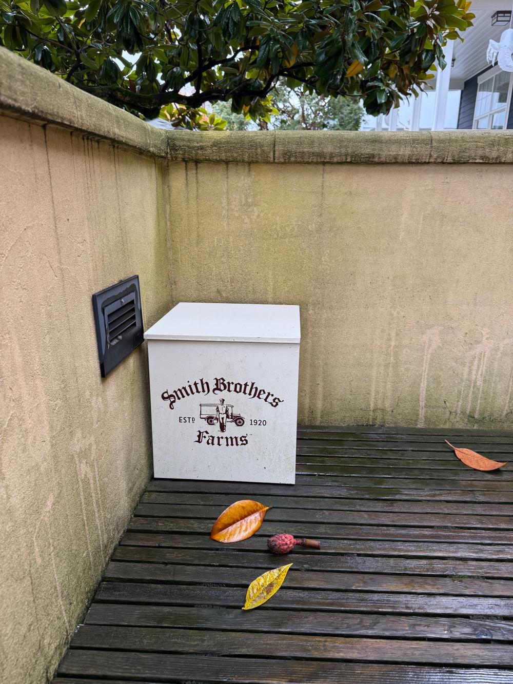 With all the kids out of the house, we no longer go through milk and those other items so quickly. We eventually concluded that it made sense to cancel the service. Jan snapped a photo of the delivery box in its spot on our front steps before they came to collect it. The box sat in that spot for so long that its removal reveals a square of lighter-colored, less weathered wood.