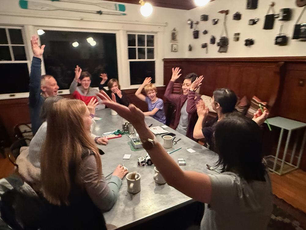 After dinner most of the group gathers at the large dining room table to play a game called Herd Mentality. It involves a lot of mooing.