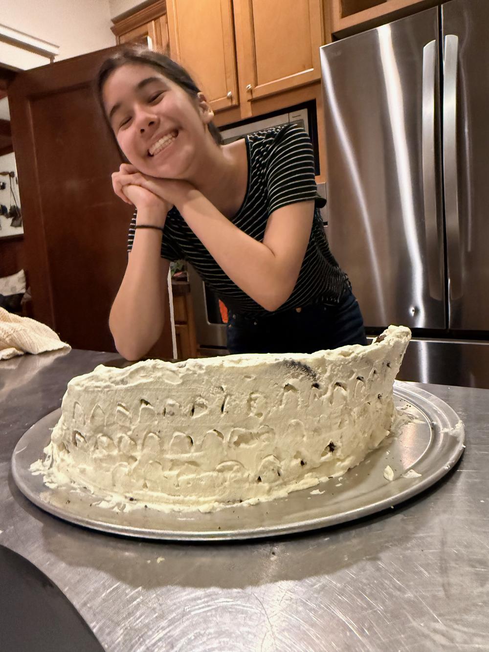 We spend the afternoon in the kitchen, which happily has two ovens so the turkey can go in one while sides go in the other. Bree and Uncle Chris enlist the help of Leif and Auden in assembling an icebox pudding. The canonical form of this dessert is a log shape, but Bree and Chris decide to construct a Roman Coliseum, including chocolate gladiators and a chocolate emperor.