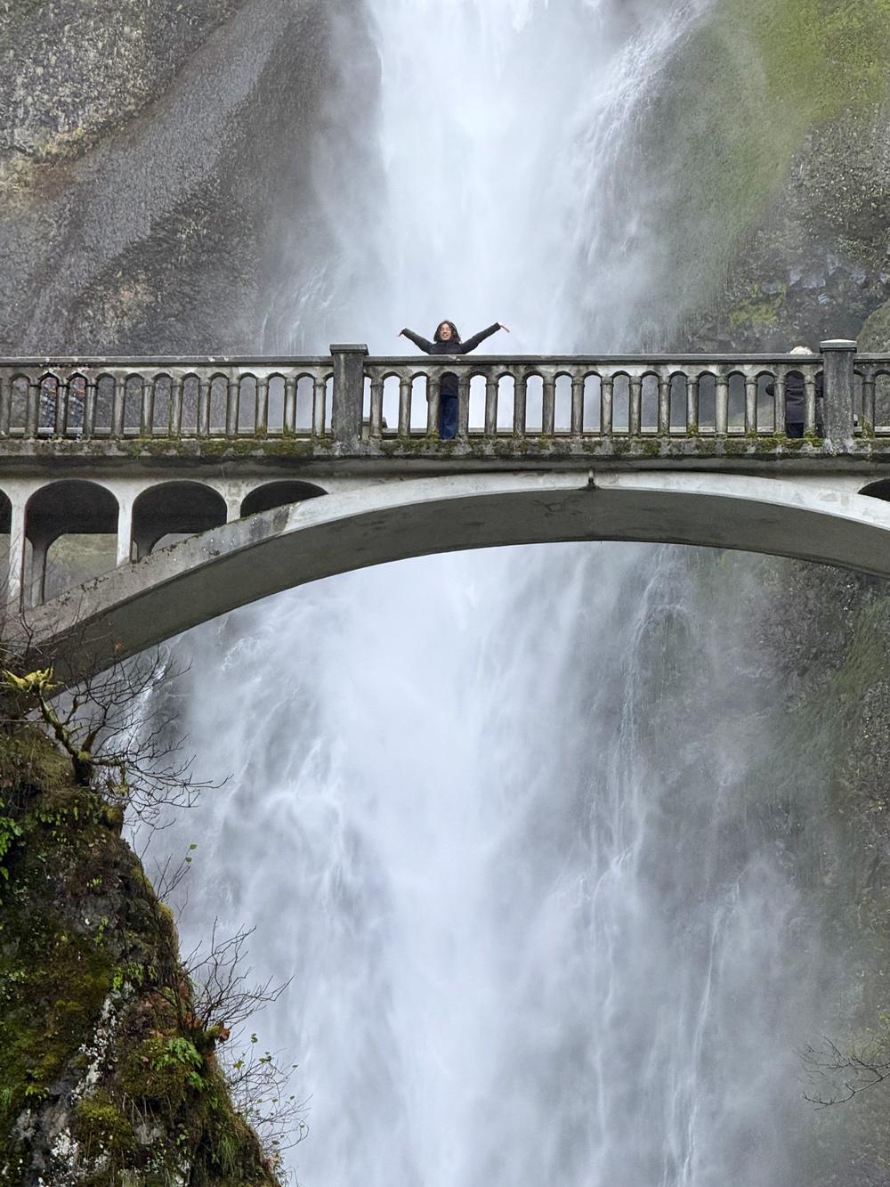 Back at the house we pack up the cars. We’re all heading west on the highway, so Jan proposes we make one more group stop at Multnomah Falls. The 600’ waterfall is amazing, as is the thin bridge below it.